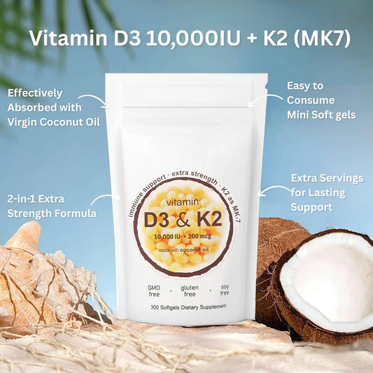 180/300 Vitamin D3 K2 Capsules with Coconut Oil - Vitamin D3 10000 iu Plus K2 (ML-7) 200 mcg, 300 Virgin Coconut Oil Softgels