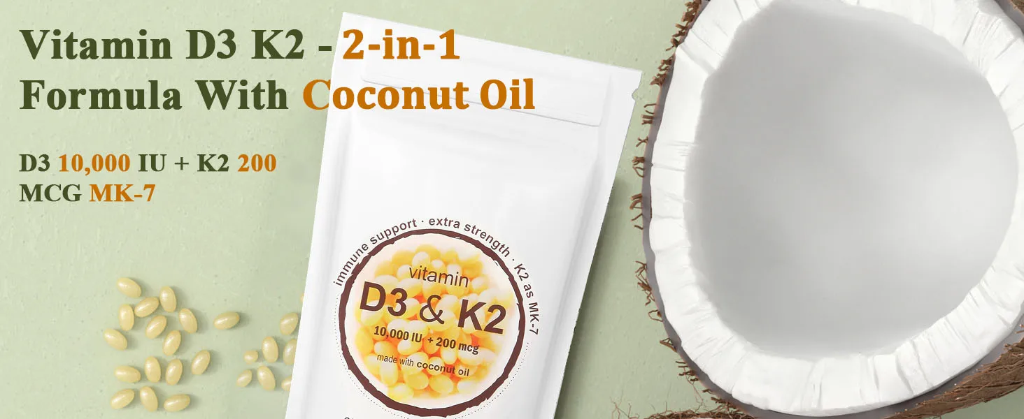 180/300 Vitamin D3 K2 Capsules with Coconut Oil - Vitamin D3 10000 iu Plus K2 (ML-7) 200 mcg, 300 Virgin Coconut Oil Softgels