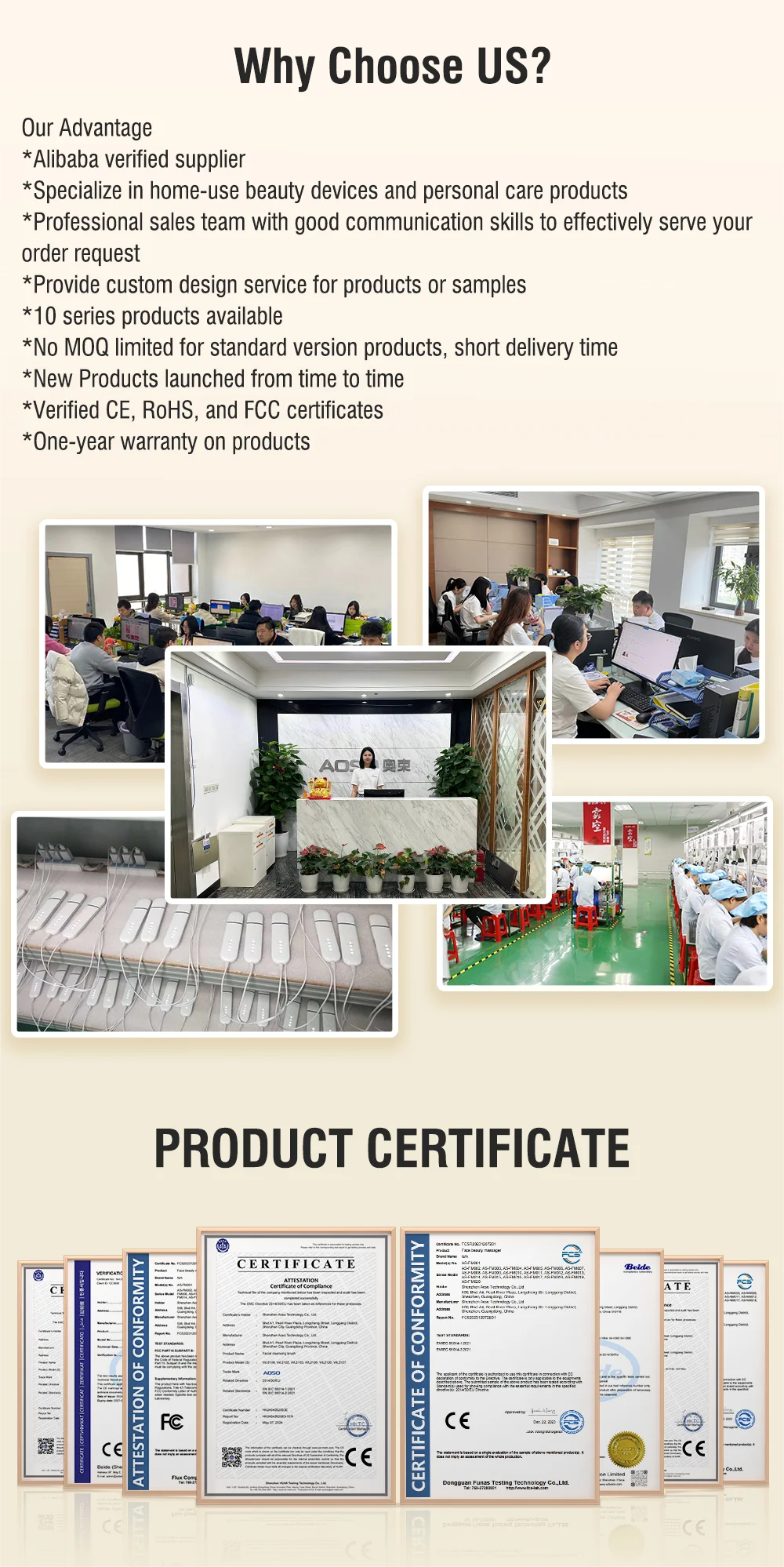 Our main products are: IPL laser hair remover, facial cleaning brushes, skin scrubber, face/neck/eye massager, blackhead remover, and other electrical products. And products passed CE ROHS FCC certifications.